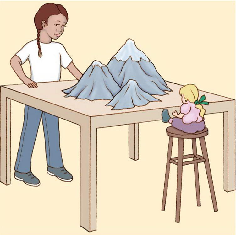 Cuanto un niño tiene una perspectiva egocéntrica asume que las demás personas verán la misma vista de las tres montañas que ellos tienen.